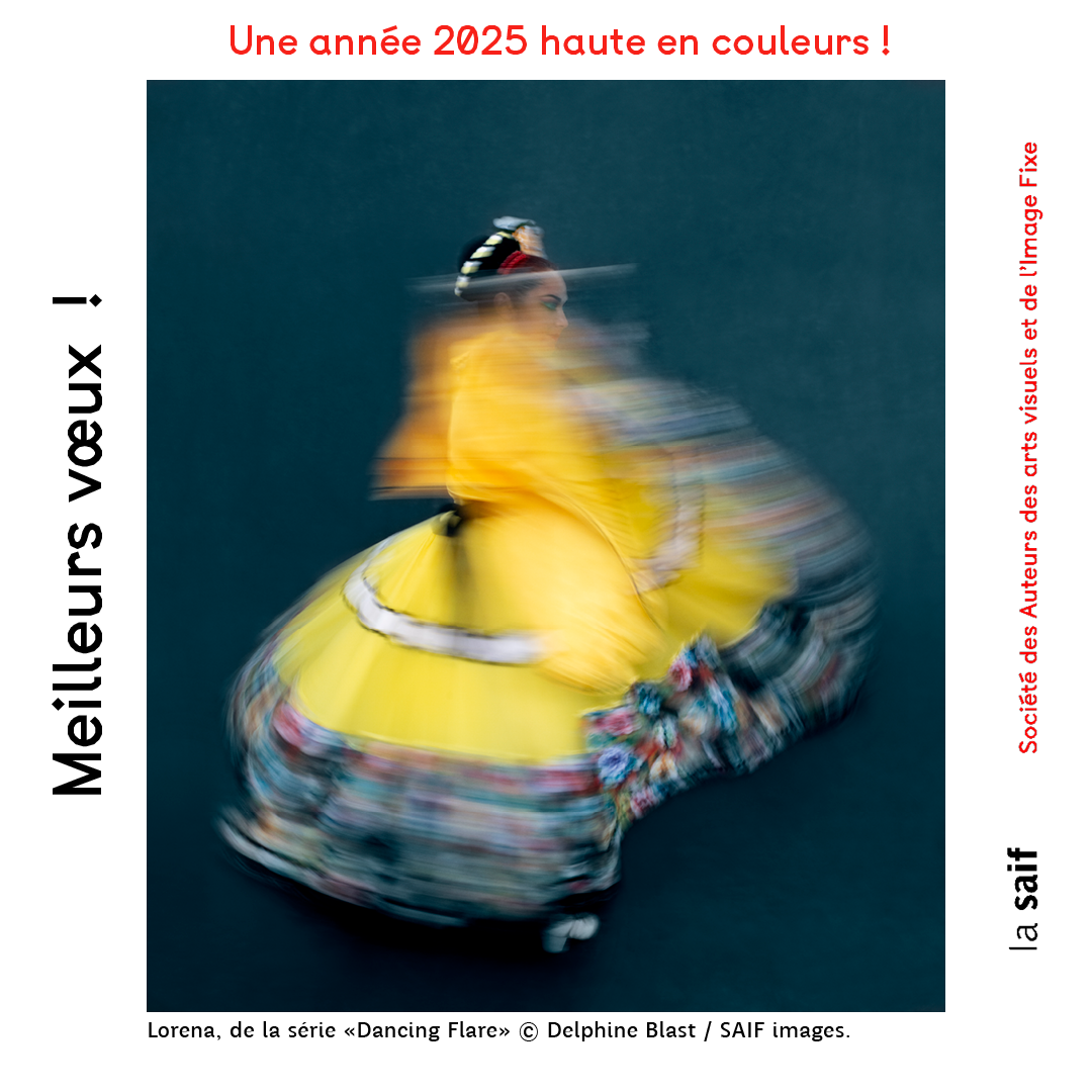 Nous remercions Delphine Blast pour sa photographie Lorena de la série « Dancing Flare » qui a été choisie pour notre carte de vœux. Son image provient de La SAIF Images, la banque d’images des auteurs et autrices de la SAIF.