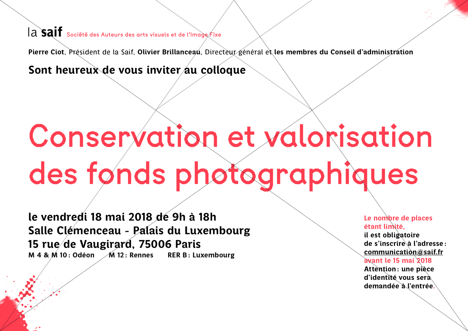 La Saif organise le colloque Conservation et valorisation des fonds photographiques le vendredi 18 mai 2018 de 9h à 18h dans la Salle Clémenceau du Palais du Luxembourg.